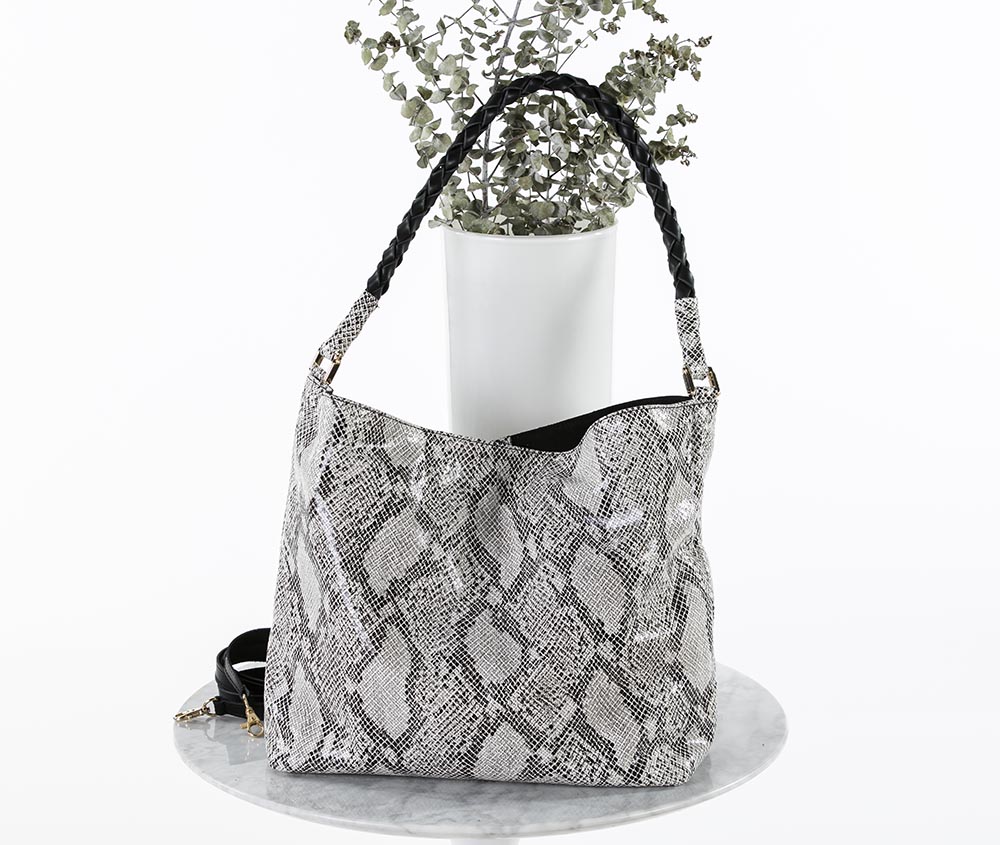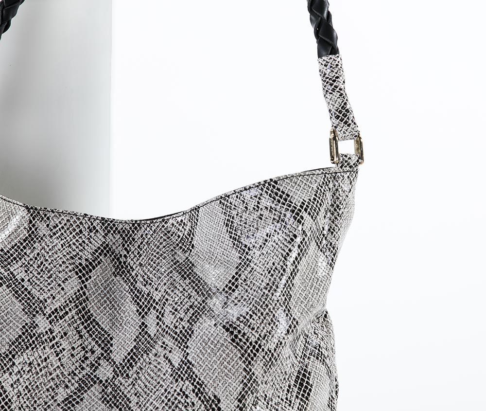 Bolso tipo saco de piel vacuno efecto serpiente y asa de hombro redonda trenzada a mano. También lleva asa larga para colgar o cruzar y bolsillo interior. Va forrado y tiene cierre de imán. Lleva todos los herrajes en dorado.