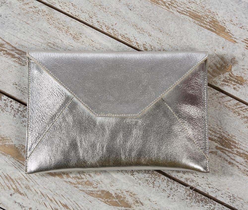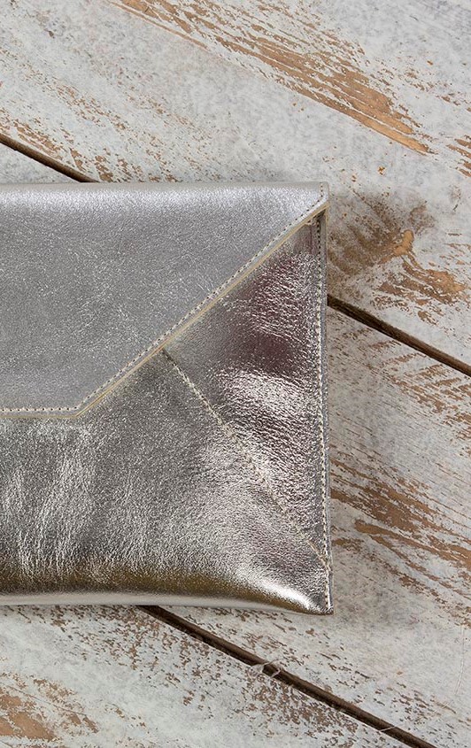 Cartera de mano tipo sobre en con piel de vacuno en plata, lleva cierre de imán y cadena fina para colgar también en dorado. Interior forrado en tela de algodón y bolsillo plano tamaño móvil. Tiene el tamaño perfecto para llevar en ocasiones formales y también más sport.