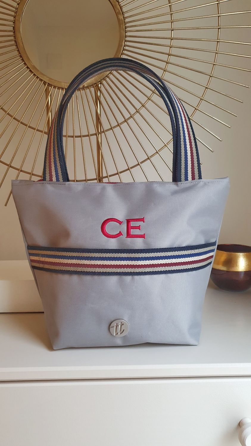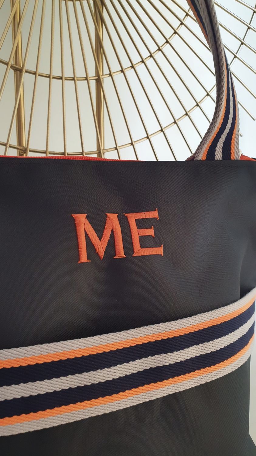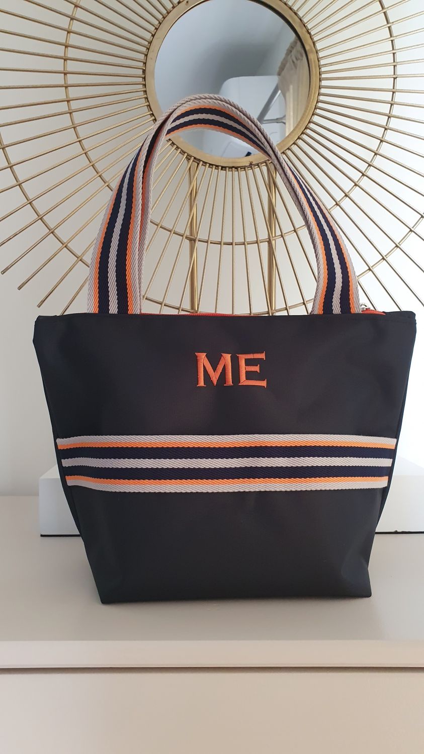 Bolso de mano personalizado hecho con tela de nylon y asas cortas de colores, lleva un bolsillo exterior rematado con la misma cinta. Cierre con cremallera y forro con bolsillo interior.