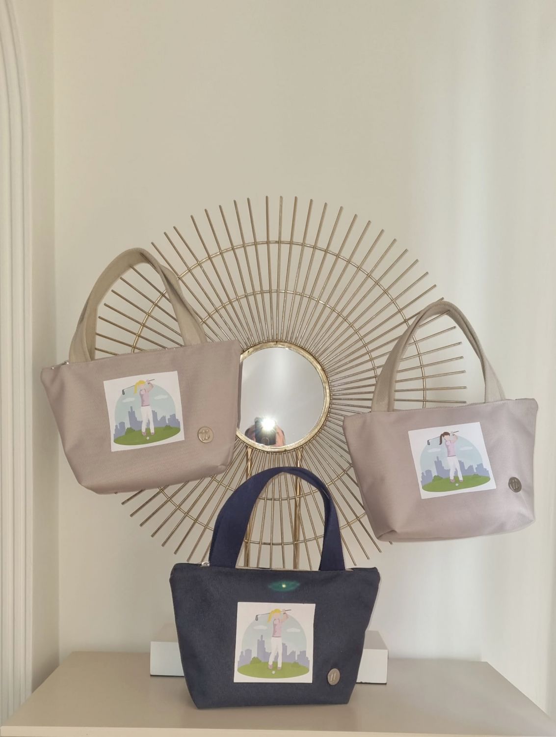 Bolso de mano de tela de poliéster y asa de mano con motivo de golf en el exterior. Puedes elegir entre "Chica Rubia" o "Chica Morena", puedes indicarlo en OBSERVACIONES Plazo de entrega: 15- 20 días laborables.