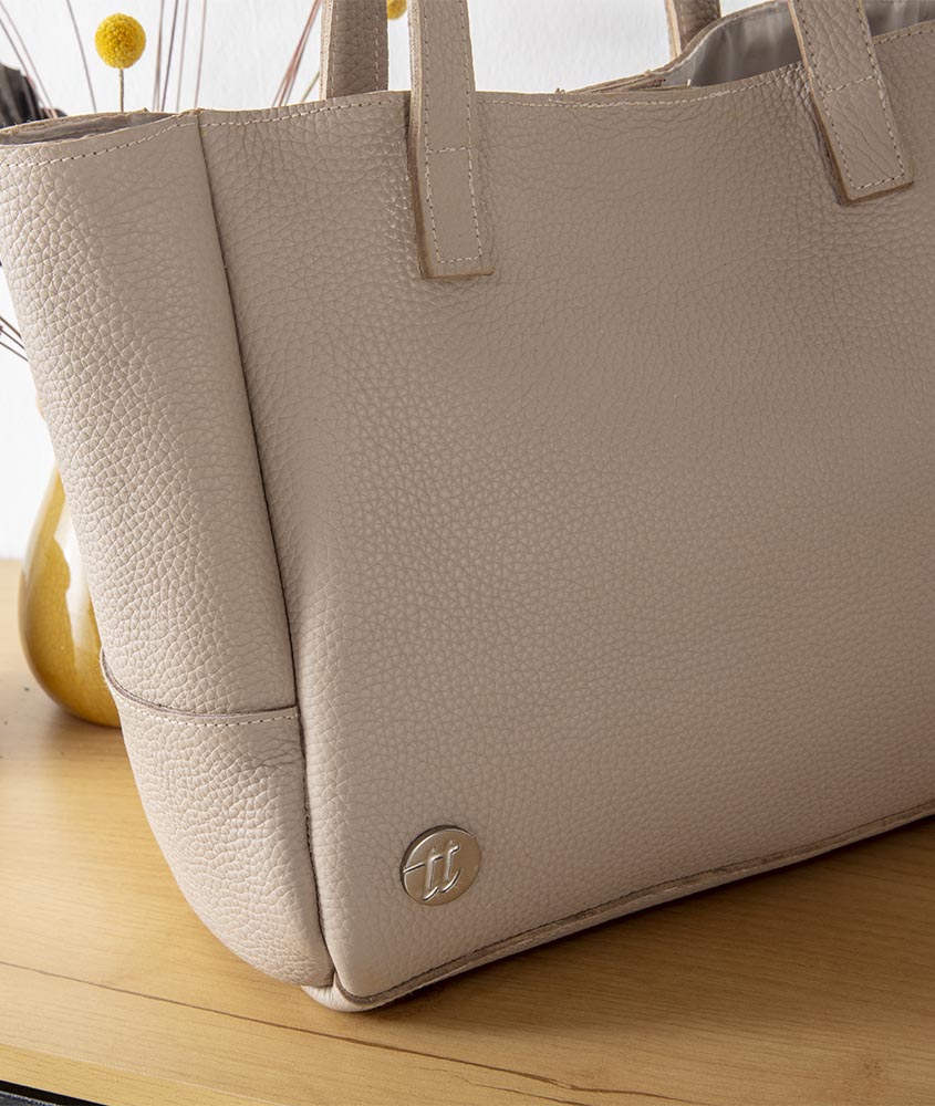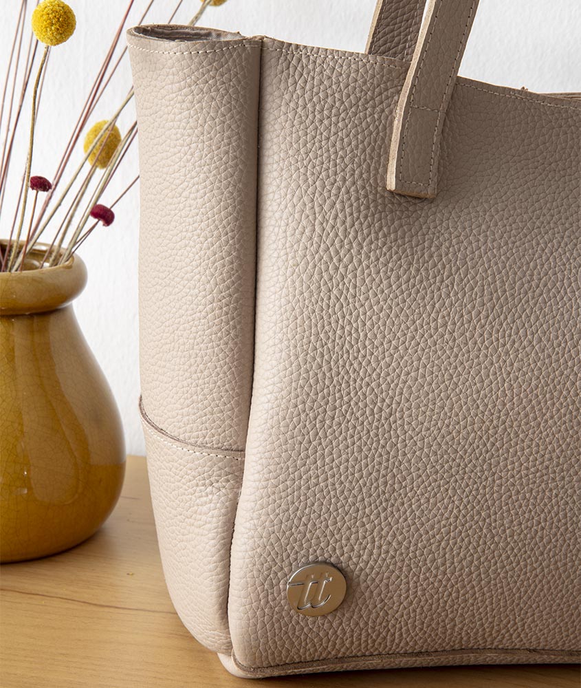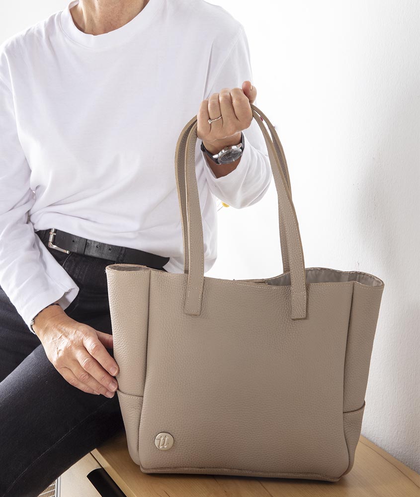 Bolso tipo shopping bag tamaño mediano hecho en piel natural color topo, lleva dos cómodas asas de hombro, cierre de imán y está forrado con un bolsillo plano. Hecho a mano en España.