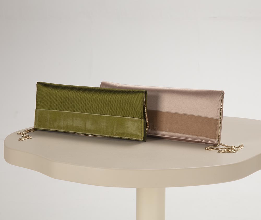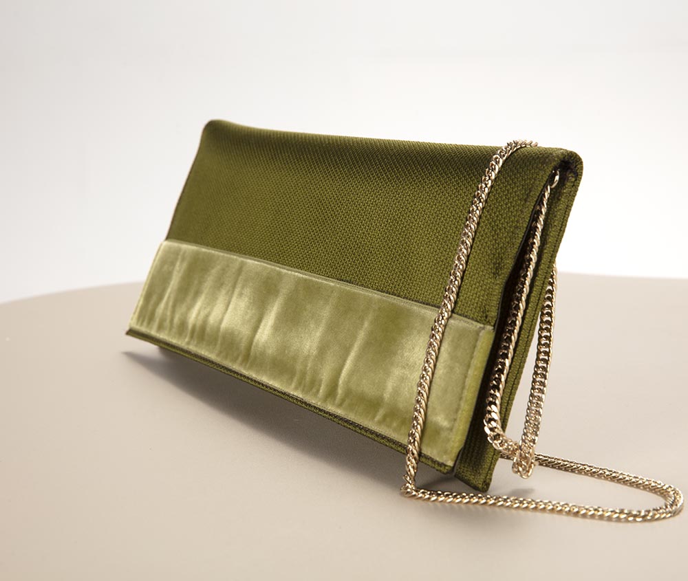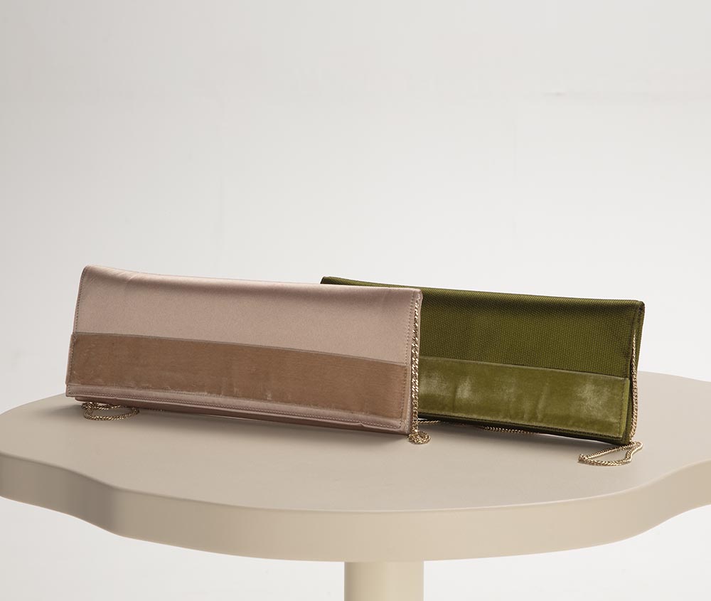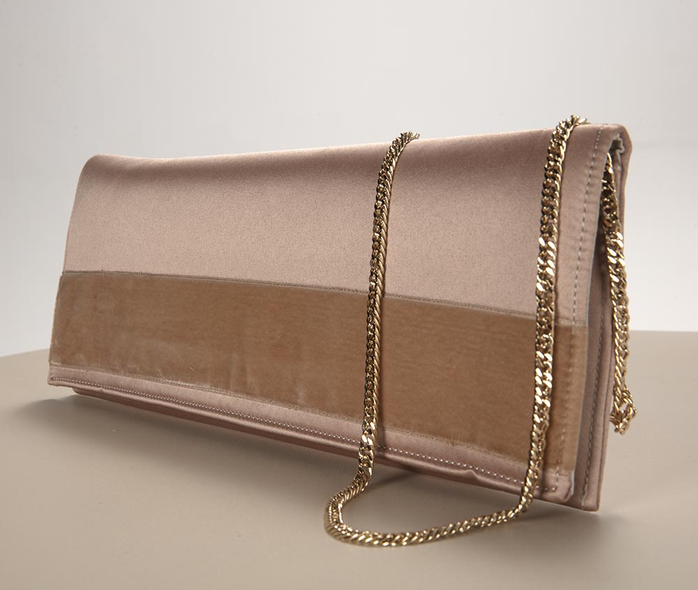 Cartera de mano recta, hecha con tejido de raso y cinta de terciopelo en la solapa.