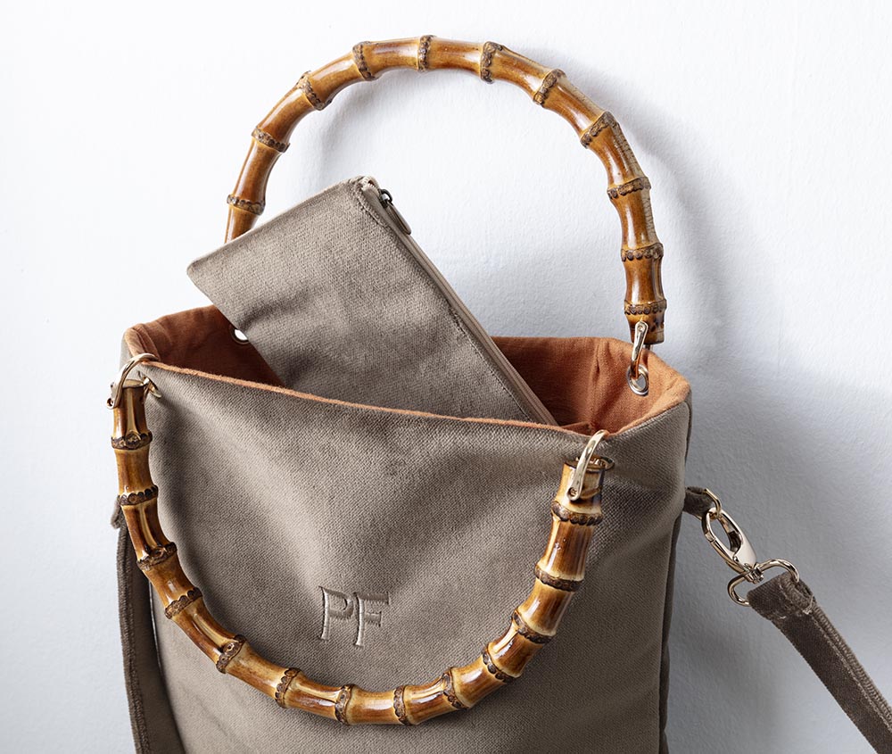 Bolso de terciopelo topo con asas de bambú natural y otra larga para cruzar del mismo terciopelo. Se puede personalizar bordando tus iniciales. Hecho a mano en España con materiales nacionales de calidad
