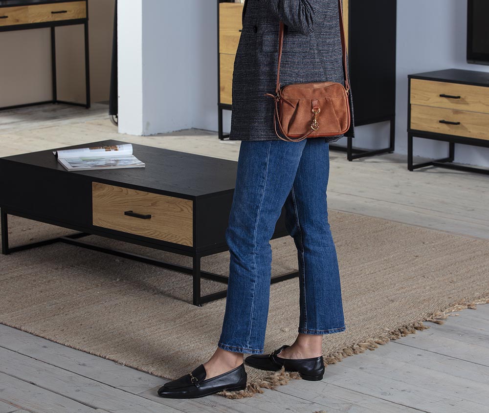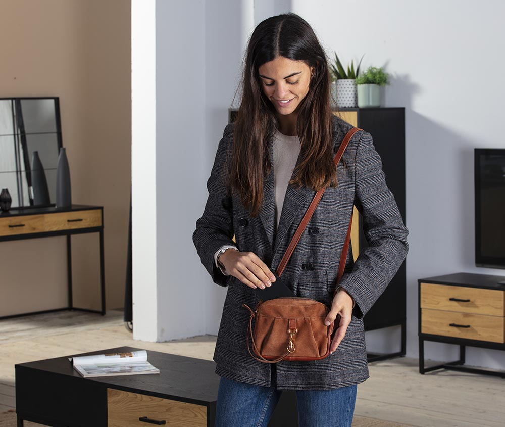 Bandolera de piel natural y serraje al tono hecho a mano, lleva asa larga regulable y cierre de cremallera