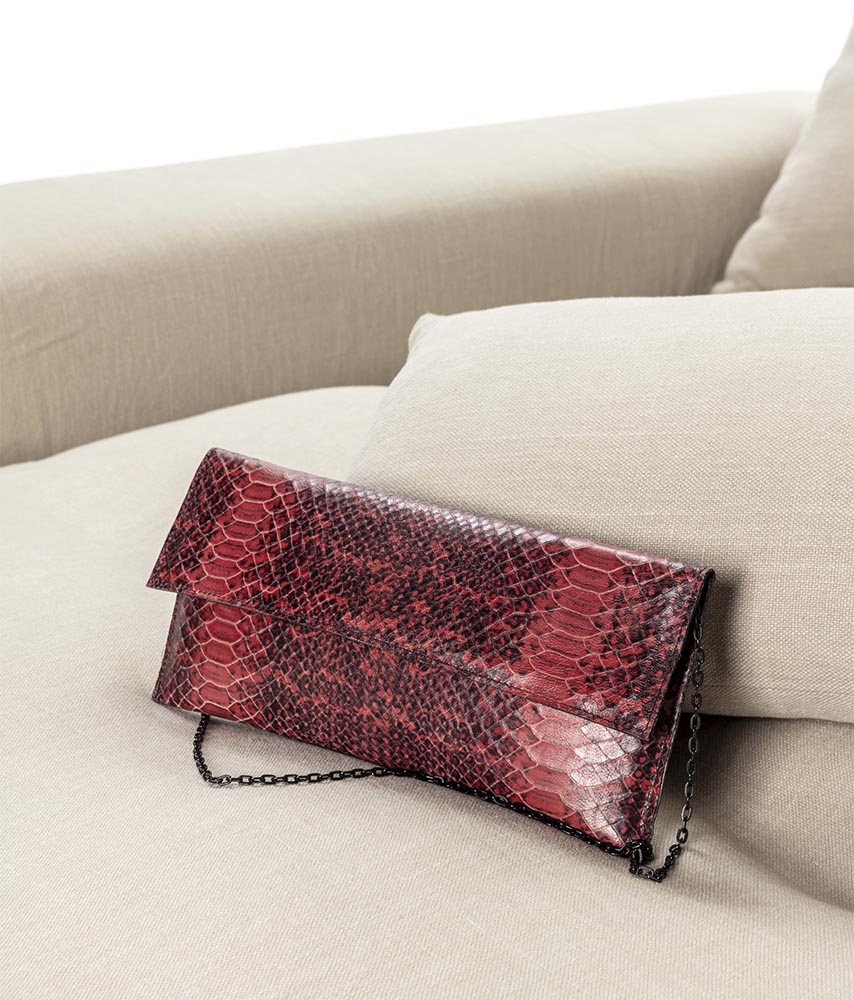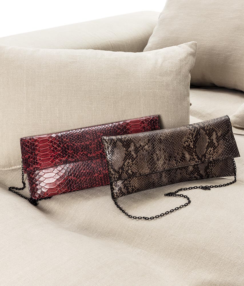 Cartera hecha con piel natural de líneas rectas con el print de serpiente tradicional y una cadena negra muy especial